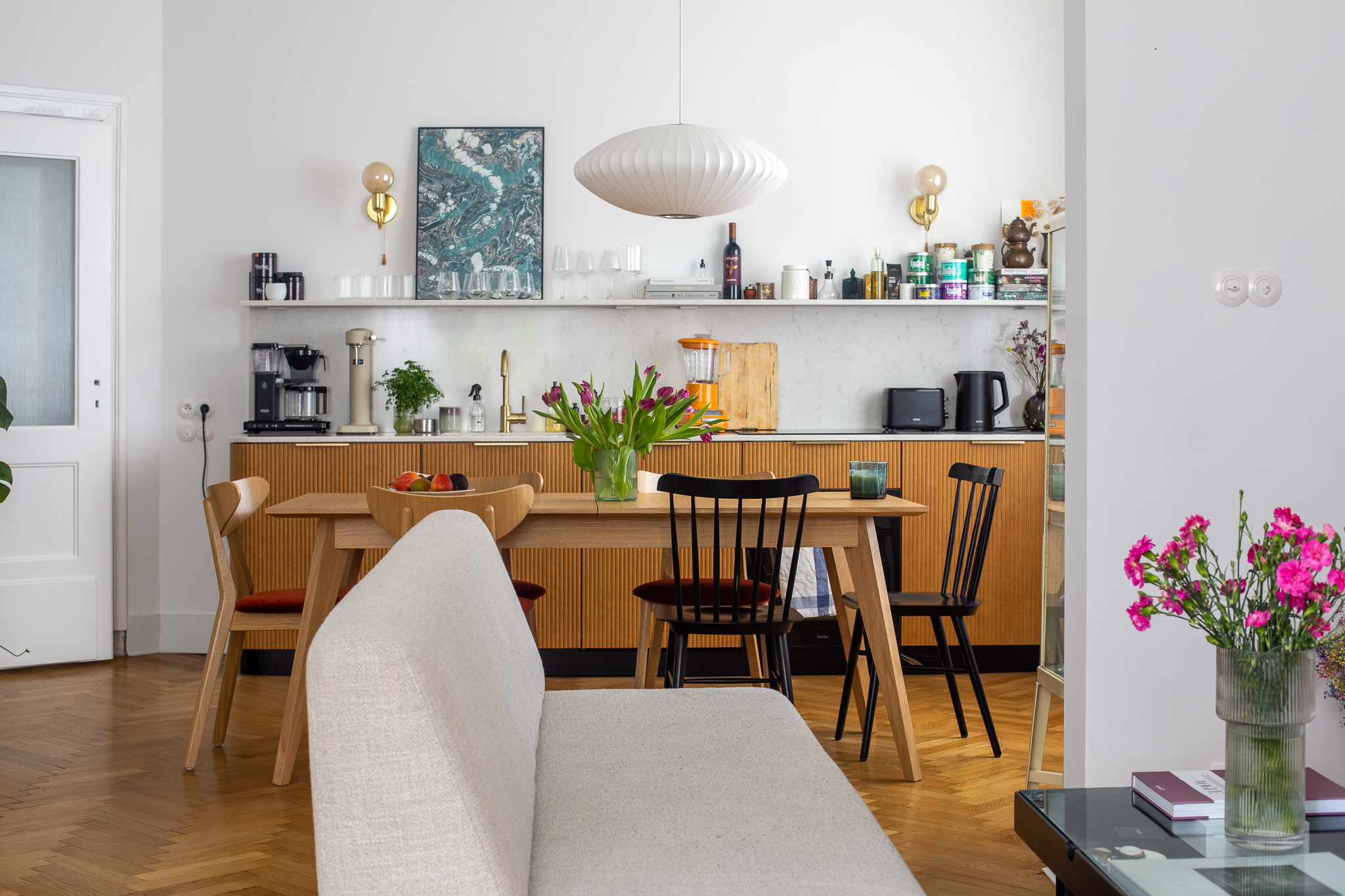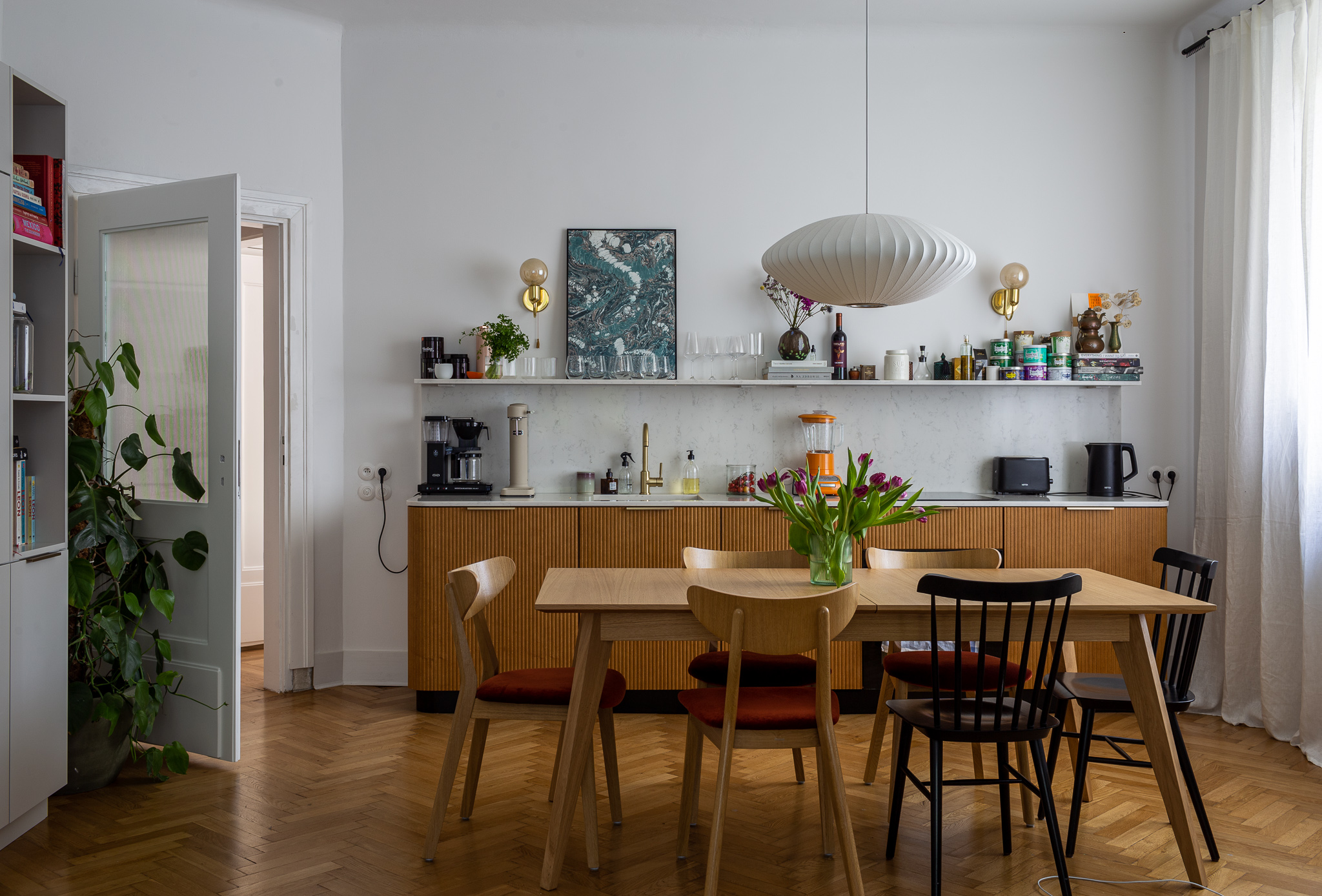 The vintage furniture adds to the classic vibe of the place, making it feel like you’ve stepped back in time. The standout feature of the apartment is the large dining room, designed for entertaining friends and sharing food and moments.