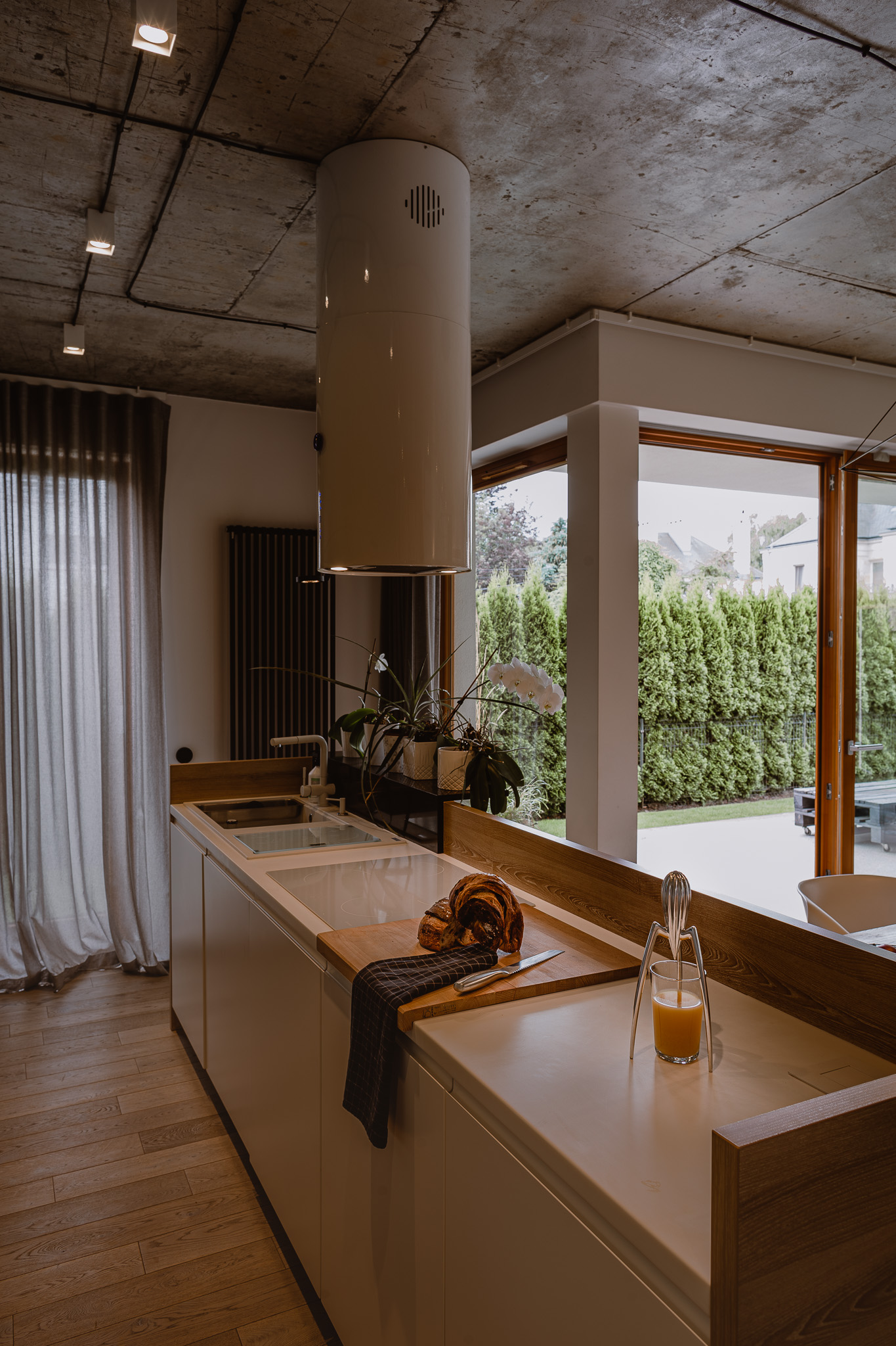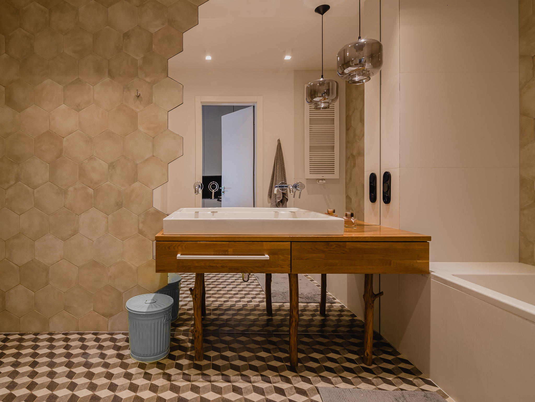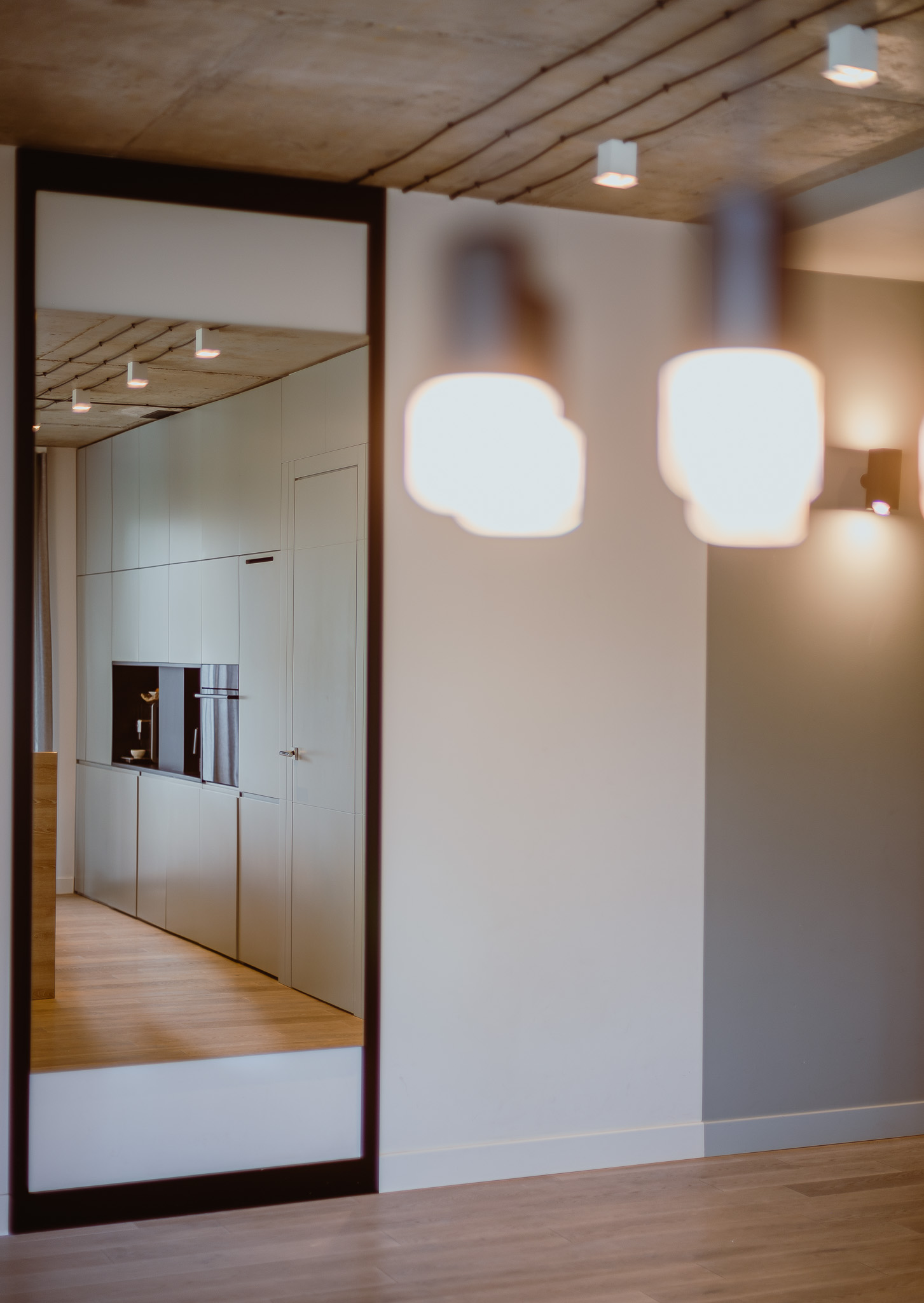 Ceiling made of polished concrete, the wiring left exposed and hidden door giving the space a modern edge. Mesmerizing interplay of light and shadow, lending an air of sophistication to the space. The bedroom, meanwhile, exudes a subtle elegance, with delicate touches that envelop one in serenity and calm. Photoshoot made for commercial purposes.