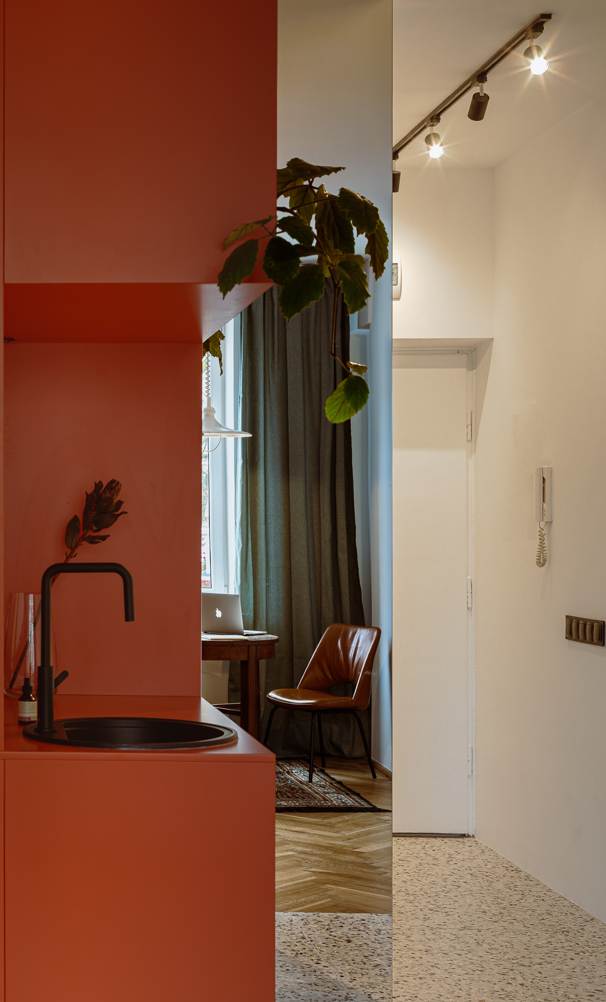 The small studio, thanks to the clever use of mirrors, gives the impression of something much, much bigger! A bold color accent, wooden floor, vintage furniture create a really unique space. Terazzo style tiles, some retro quirks perfectly correspond with atmosphere of the building where this flat is placed.